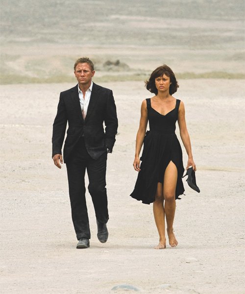 Dans Quantum of Solace, Olga Kurylenko porte cette robe de cocktail Prada durant une grande partie de l’action du film, la transformant en une pièce complètement déchirée, couverte de poussière et ruinée. Prada a dû fournir une vingtaine de robes en fonction des différents stades de dégradation. Daniel Craig porte un smoking impeccable en mohair Tom Ford, qui a également été largement abîmé. Photography by Karen Ballard; QUANTUM OF SOLACE. © 2008 Danjaq, LLC and Metro-Goldwyn-Mayer Studios Inc. All Rights Reserved.