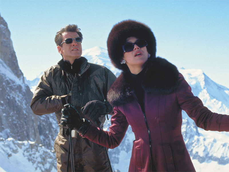 Pierce Brosnan et Sophie Marceau dans les montagnes enneigées de France pour Le monde ne suffit pas. Lindy Hemming a imaginé ces deux tenues de ski : la combinaison de ski de Pierce Brosnan est signée Omega Outdoor Agencies et ses lunettes de soleil Calvin Klein. Photography by Keith Hamshere; THE WORLD IS NOT ENOUGH. © 1999 Danjaq, LLC and United Artists Corporation. All Rights Reserved